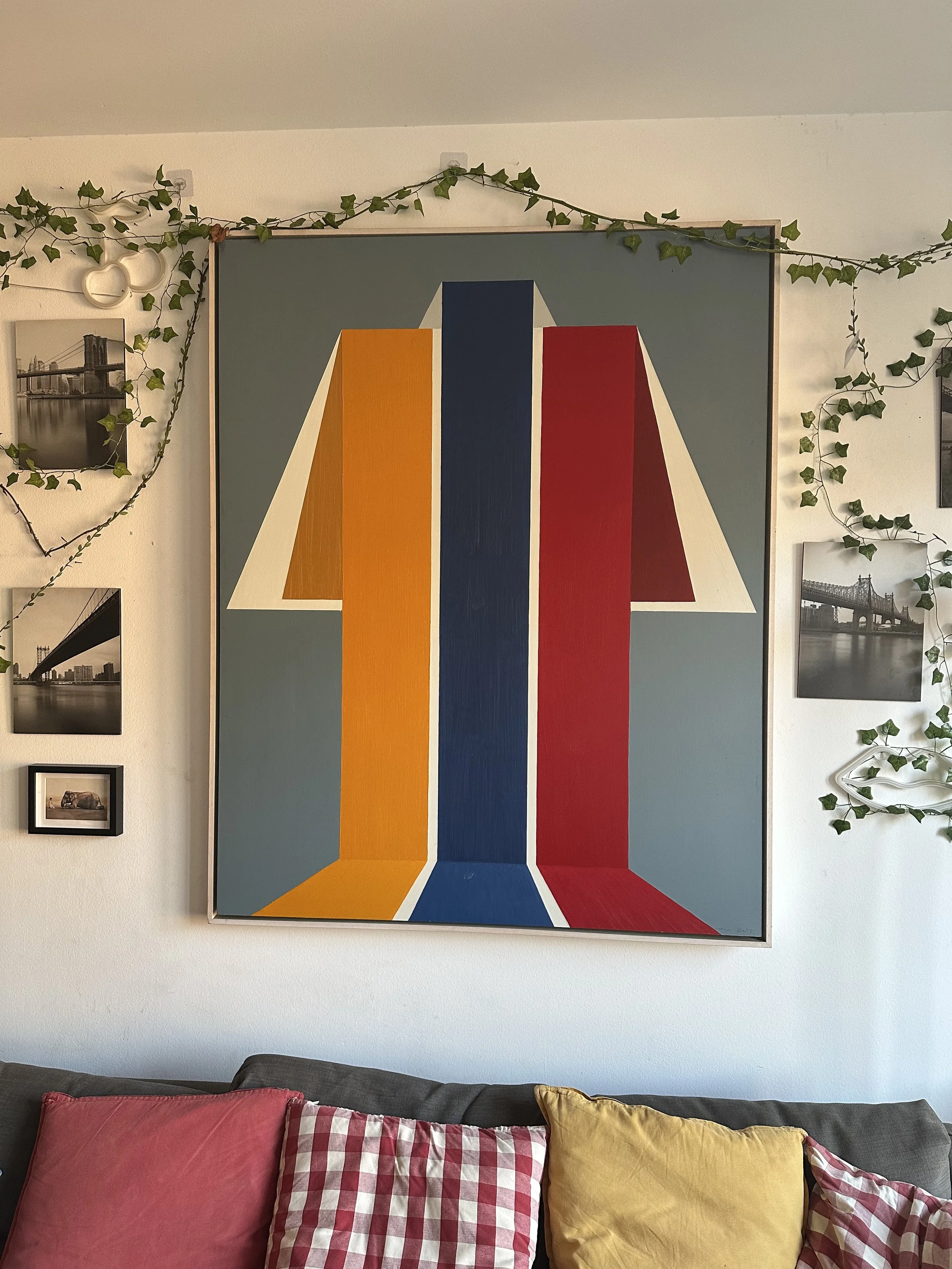 Primero presidió la chimenea de ladrillo blanco en mi piso de Hell's Kitchen (56th Street and 9th Avenue), donde era imposible no verlo al entrar: imponía, llenaba el espacio de sentido. Era protagonista, un tótem de color que me recordaba que el arte auténtico tiene alma y contexto. Al mudarme a Barcelona, lo guardé en un trastero porque no es posible volar con un equipaje de esas dimensiones. Cuando finalmente tuve un piso para establecerme, regresé para preparar el envío de mi pieza de arte en un contenedor que tardaría un mes en llegar a su destino final.